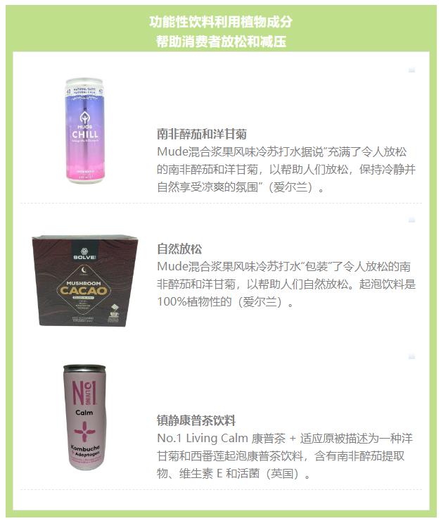 在所有與睡眠支持相關的草藥成分中,洋甘菊是功能性飲料中最常見的,具有壓力和睡眠功能聲明,其次是檸檬香蜂草和薰衣草。